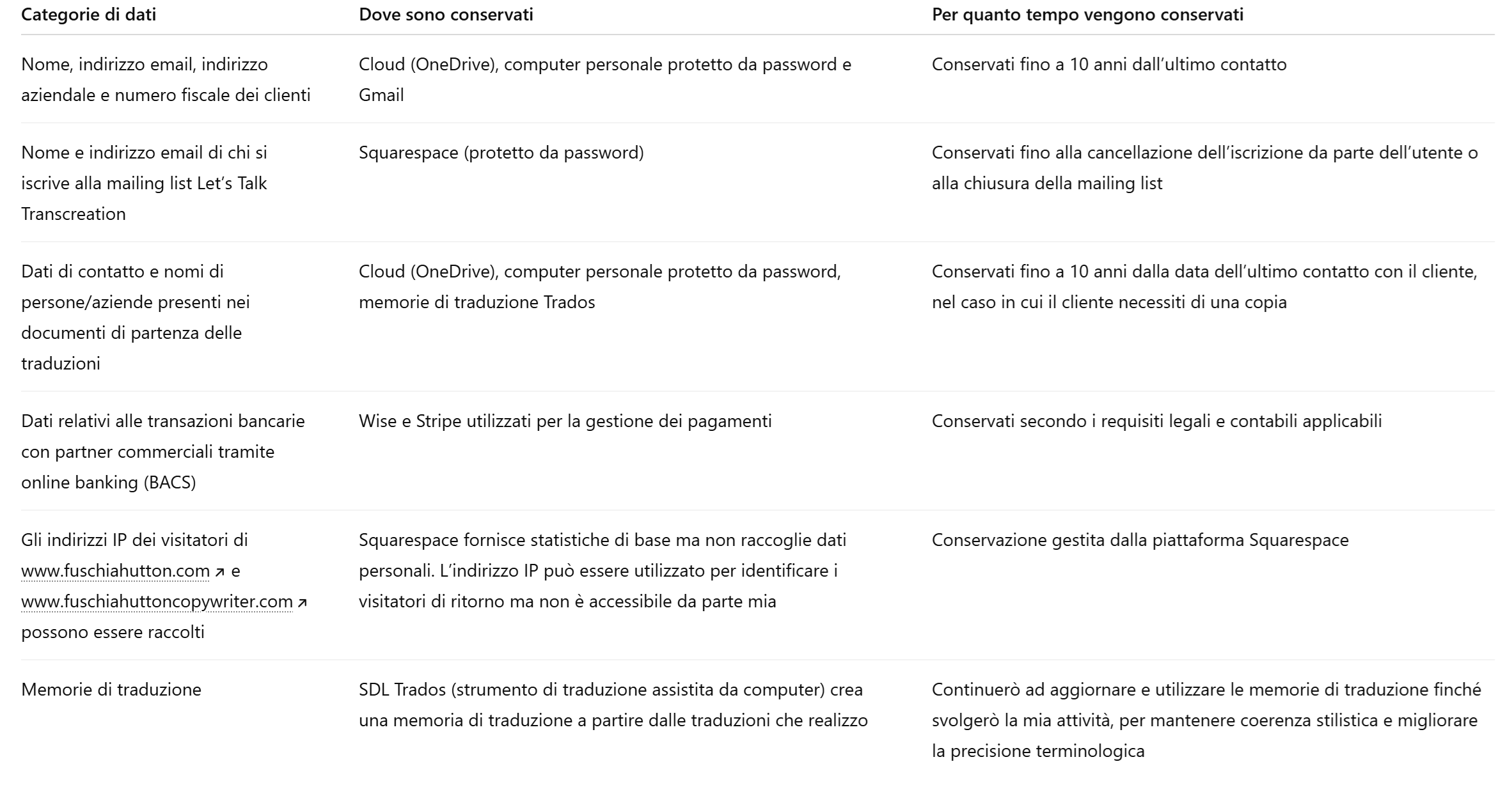 www.fuschiahutton.com e www.fuschiahuttoncopywriter.com utilizzano il pacchetto di cookie di base integrato in Squarespace. Questo serve a verificare chi è l’utente e a fornirmi informazioni su quanti visitatori riceve il sito, quali pagine visitano e il loro paese di provenienza. Non memorizza alcuna informazione personale.